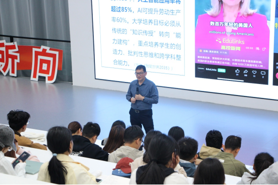 通过详细数据分析,许涛教授向师生们说明:“到2035年,人工智能应用率预计将突破85%,劳动生产率可提升60%。这一趋势正在重塑教育体系和人才需求标准,大学培养目标必须从传统‘知识传授’转向‘能力建构’,重点打磨学生的创造力、批判性思维与跨学科整合能力。”